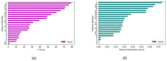 Prioritized features for crack dimensions. (a) F Score-based prioritized features for Crack Length. (b) MIS-based prioritized features for Crack Length. (c) F Score-based prioritized Features for Crack Depth. (d) MIS-based prioritized features for Crack Depth. (e) F Score-based prioritized Features for Crack Width. (f) MIS-based prioritized features for Crack Width.