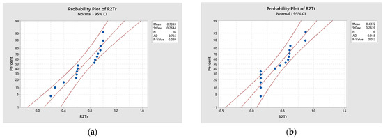 The ANOVA Test is used to analyze the differences among the means of different groups using variance and to prove which groups are statistically significant. To prove that the performance is significantly different for various ML models, an ANOVA test [24] is implemented in this work. Figure 3 represents the probability plot of performance measures of the ML model obtained by executing the Python codes. It is understood that the values of R2 and RMSE of both training and testing are within the 95% confidence interval and that their probability values are greater than 0.005. This shows that the experimentation results are acceptable for crack length prediction. Similarly, for crack depth and crack width, the p-value shown in Figure A1 and Table A6 is greater than 0.005, which reveals that the experimental results obtained are acceptable.