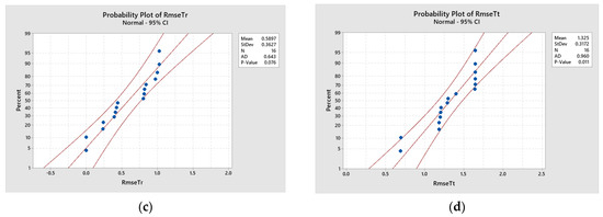 Probability Plot of Performance Measures of ML Models in Crack Length. (a) Probability Plot for Crack Length-R2Tr. (b) Probability Plot for Crack Length-R2Tt. (c) Probability Plot for Crack Length-RMSETr. (d) Probability Plot for Crack Length-RMSETt.