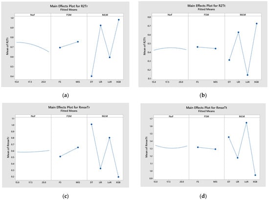 The main and interaction effect plots of parameters are depicted in Figure 4a–h for crack length prediction. It is inferred from Figure 4a,b that the mean value of R2Tr is higher when the parameters are MIS, 15, and XGB, whereas in R2Tt the parameters are FS and 18, respectively. It is understood from Figure 4c,d, that for getting the lower mean value of RMSETr and RMSETt, the parameters are to be set in a different way than R2Tr and R2Tt. From Figure 4e,f, it is noted that increasing the NoF value decreases the R2Tr value for all ML models, whereas in R2Tt except MLM and DT in all other models, it increases. Using XGB, a lower RMSE is reported in Figure 4g,h.