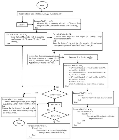 | Initialize no. of grey wolf (Xj—i = 1,2,…ng) and its positions as ‘nof’ number of randomly selected features from the given 22 GLCM features list While (itr < nitr) Determine the fitness function fvi (i = 1,2,…ng) of each wolf—Performance of ML model In terms of R2 and RMSE values for both training and testing data sets using Deng’s Method Sort fvi in descending order and set as sfi and store the first wolf’s data as Xitr. and Fvitr. Using the sorted data sfi, assign Xa. = X1., Xb. = X2. and Xd. = X3. Compute For each wolf Update the position using b1 = 2 × b × rand()-b and c1 = 2 × rand() and Da. = abs(c1 × Xa. − Xi.) and X1. = Xa. − b1 × Da. b2 = 2 × b × rand()-b and c2 = 2 × rand() and Db. = abs(c2 × Xb. − Xi.) and X2. = Xb. − b2 × Db. b3 = 2 × b × rand()-b and c3 = 2 × rand() and Dd. = abs(c3 × Xd. − Xi.) and X3. = Xd. − b3 × Dd. Xi. = (X1. + X2. + X3.)/3 Check Xi. within bounds End End Display the best objective values with their no. of features and their combinations |