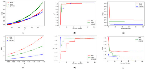 Pareto and Convergence Plot for Crack Width. (a) Pareto Plot for Training Data Set—Crack Width. (b) R2 Convergence Plot for Training Data Set—Crack Width. (c) RMSE Convergence Plot for Training Data Set—Crack Width. (d) Pareto Plot for Testing Data Set—Crack Width. (e) R2 Convergence Plot for Testing Data Set—Crack Width. (f) RMSE Convergence Plot for Testing Data Set—Crack Width.