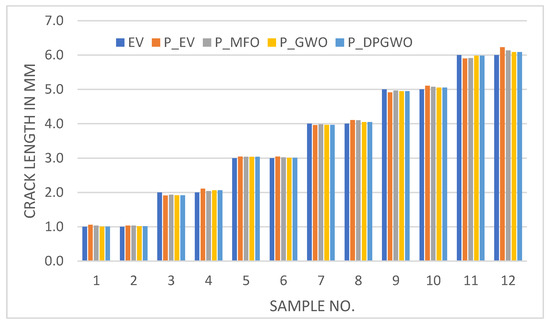 In this work, a total of six different ML models have been used, in which a different combination of four models is considered for each crack dimension. The ML models’ names are described in Table 2. The parameters and their levels considered for crack length are represented in Table 3. The ML models considered for crack depth and crack width are represented in Table A1 and Table A4. Table 4 represents the experimental parameter settings of the L16 Taguchi orthogonal array for the given combination of levels of parameters mentioned in Table 3, obtained using Minitab 19 Software, where 16 represents the minimum number of experimental runs required to conduct the experiments and to find the best parameter settings [28]. For each experimental run corresponding to its parameter settings, Python code has been executed for the training data set with a sample size of 95 images’ features and tested with a data size of 20 images. The performance of the ML model is recorded for each experiment based on the R2 and RMSE values of both the training and testing data sets. Deng’s method has been implemented to select the best ML model based on the overall performance index calculated using R2 and RMSE values, which are listed in Table 4. L16 Taguchi orthogonal array and Deng’s values for crack depth and crack width are presented in Table A2 and Table A5.