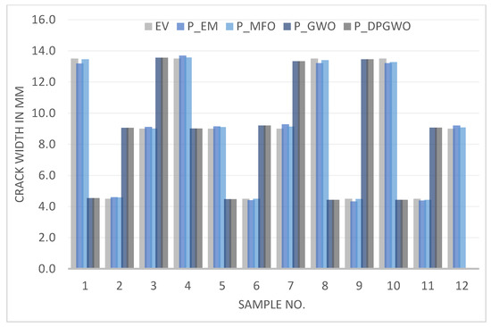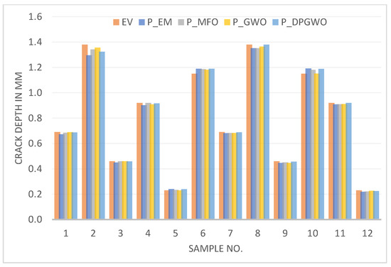 Statistical Analysis of Output using different algorithms for crack depth and crack width. (a) Statistical analysis of output using MFO for Crack Depth. (b) Statistical analysis of output using GWO for Crack Depth. (c) Statistical analysis of output using DPGWO for Crack Depth. (d) Statistical analysis of output using MFO for Crack Width. (e) Statistical analysis of output using GWO for Crack Width. (f) Statistical analysis of output using DPGWO for Crack Width.