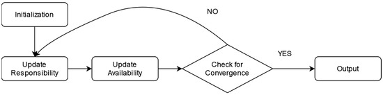 The initialization step prepares the data, converts the grid to a set of data points, and calculates the similarity matrix S. Then, the responsibility matrix R is updated. The responsibility matrix reflects how well suited a data point is to serve as the exemplar for the other data points. Next, the Availability matrix is updated. This matrix reflects how suitable an exemplar is for each data point to serve as its exemplar. Finally, the algorithm iterates until the maximum number of iterations set, or until there are no changes from the last iteration.