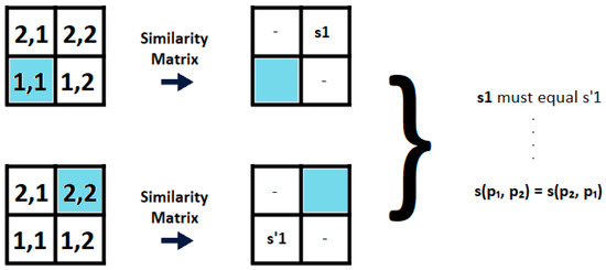 Two points (denoted with blue color) will always have the same similarity matrix with each other. In practice, this means that going from point p1 to point p2 has the same cost as going from point p2 to p1.