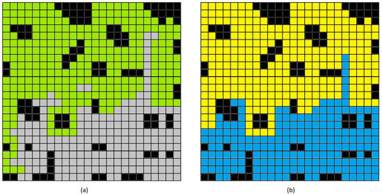 The initial environment as depicted in (a) contains two layer types (denoted by green and gray cells). The output of the algorithm in (b) shows the two clusters (blue and yellow), as they were generated by the algorithm. It is worth mentioning that different values of the importance value may result in slightly different clusters.