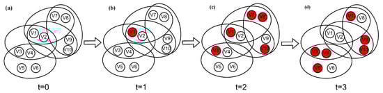 Description of the global information transmission process. Red nodes represent I-state individuals and hollow nodes represent S-state individuals. (a) At the initial moment, all nodes are in the S-state. (b) When , the node is set as the spreading seed (I-state). (c) When , the neighbor nodes , , , and of are notified to change to the I-state. (d) When , nodes , , and transition to the I-state, whereas nodes and revert to the S-state.
