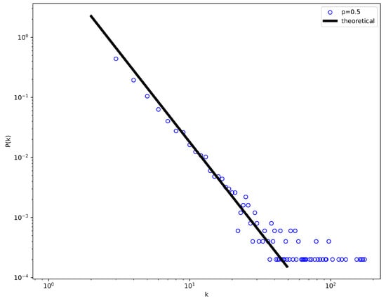 Moreover, the hyperdegree distribution shows that the power law index is not influenced by the clustering coefficient p. Therefore, we set , and 1 for the simulation. The simulation plot in double-logarithmic coordinates is shown in Figure 4. The simulation results of the hyperdegree with different parameters p overlap each other. It can be seen that the power-law exponent of our theoretical prediction of the hyperdegree distribution agrees well with the simulation results. This result shows that the aggregation phenomenon does not affect the scale-free property of the social hypernetworks and supports the argument of Section 3.2 that the hyperdegree distribution is independent of the clustering coefficient p.
