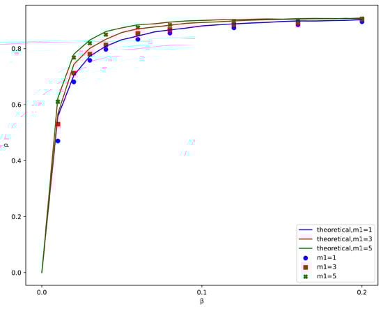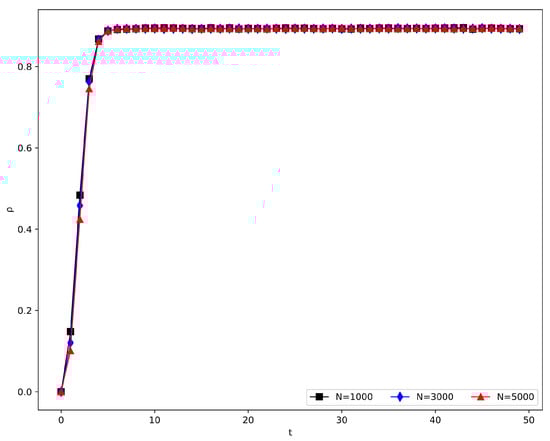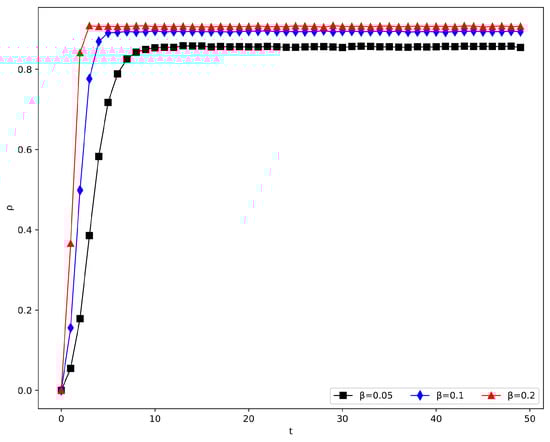 Equation (20) indicates that the informed node density at the steady state is a function that is not influenced by the clustering coefficient p or the time step t. Since there is in the denominator of Equation (20), the effect of is greater than the effect of . We set the effective propagation rate , and is proportional to . can be calculated from the structural parameters of the hypernetwork as well as the spreading rate and the recovering rate.