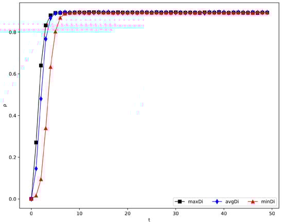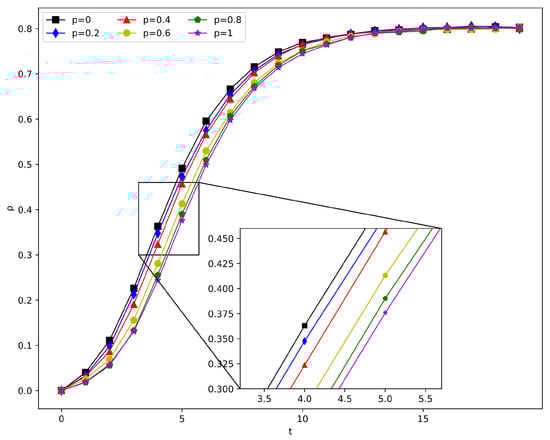 To analyze the effect of clustering coefficient p on information propagation, we set the hypernetwork construction parameters as , , , , , , and . The information propagation curves for different clustering coefficients are presented in Figure 8. As demonstrated, the information propagation rate slows down with increasing p, but all the curves tend to reach the same steady state value. The larger the value of p, the fewer direct connections between nodes and therefore, the slower the rate of information dissemination. However, when the steady state is reached, all curves converge to the same value, thus confirming the argument that is independent of p made in Section 3.2. To enhance the scientific validity of the simulation, all subsequent experiments were set with as the clustering coefficient.