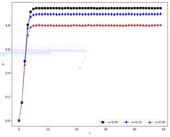 We set and , , and , to obtain the information propagation curve depicted in Figure 10. The recovering rate reflects a person’s ability to resist or forget information. As demonstrated in the figure, the three curves take almost the same amount of time to reach the maximum point, and the slope of the curves hardly varies when the recovering rate changes. This disparity indicates that the recovering rate has a small effect on the rate of information diffusion. Larger recovering rates result in lower densities of I-state nodes at the steady state.