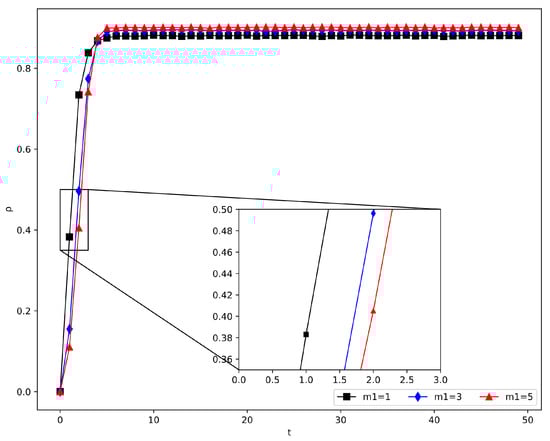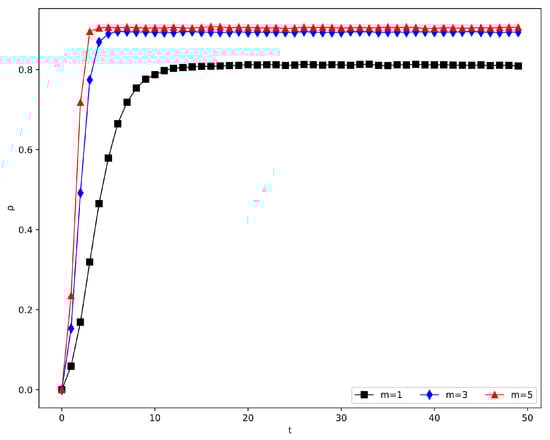 Here, m signifies the number of generated hyperedges generated every time a new node is added. To explore how m affects the propagation process, we set , , , , , , and . The information propagation graph is presented in Figure 14. As the number of hyperedges generated per new node addition increases, nodes become more closely connected, and the entire network becomes more interconnected. Therefore, larger m values boost the information propagation efficiency, resulting in higher steady-state values.