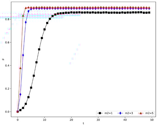 Here, denotes the quantity of old nodes chosen when new nodes enter the network. To evaluate the effect of on the information spreading process, the following parameters were set: , , , , , , and . The information propagation curves for different ’s are depicted in Figure 12. The increase in the number of selected old nodes means that the average hyperdegree of the supernetwork then increases. As the simulation results indicate, the closer the relationship between individuals and society, the higher the average hyperdegree, the more quickly information spreads, and the more widely information disseminates.