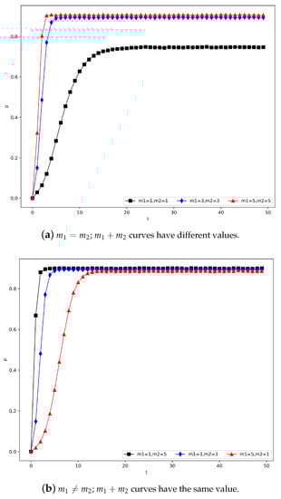 In this paper, denotes the number of new nodes that join the hypernetwork at each time step. In order to investigate how influences the propagation process, the following parameters were established: , , , , , , and . The information propagation curves for various values are presented in Figure 11. As depicted in the figure, the curves exhibit slight differences, and the information propagation accelerates with increasing values. It can be concluded that an increase in can promote information dissemination, but the change is not very significant.