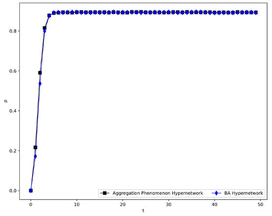 To analyze the process of information propagation under diverse hypernetwork structures, two hypernetworks were generated with : the aggregation-phenomenon hypernetwork and the BA scale-free hypernetwork. The network structure parameters were set as , , , , , and , and the clustering coefficient of the aggregation-phenomenon hypernetwork was . Figure 15 illustrates the comparison between the aggregation-phenomenon hypernetwork and the conventional hypernetwork under the same parameters, where the curves of the propagation rate and steady-state values are almost identical. In fact, when the clustering coefficient , the model becomes the BA hypernetwork model, which the simulation results corroborate. Thus, the model introduced in this paper is a generalization of the BA hypernetwork model. Moreover, in social hypernetworks, friends of friends are more likely to build friendships. Consequently, the hypernetwork structure of aggregation phenomena better reflects reality, providing a distinctive advantage that cannot be achieved by BA hypernetworks.