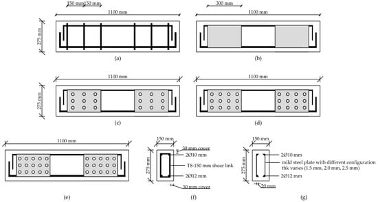 Shear reinforcement of T8 at 150 mm spacing was installed in the control specimen, as illustrated in Figure 2a,f. The control specimen was labelled specimen CS.