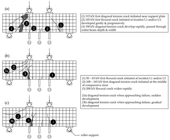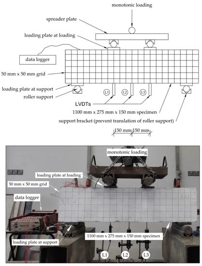 A four-point loading test was adopted for this study. A Magnus Test Frame with a maximum capacity of 300 kN was used to study the performance of the thirteen specimens. The specimens were preloaded to ensure that the instrument was functioning properly and to avoid any poor contact [17]. The specimens were loaded monotonically under displacement control at a loading rate of 0.01 mm/s [18]. The load was applied to the specimen through two loading steel plates at the top of each specimen [18]. The center-to-center distance between the two loading plates was set at 300 mm. All the specimens were simply supported by two bearing plates at the reaction base, with a clear span of 800 mm. Steel roller supports were placed at the soffits of both reaction bases to provide hinged support for the specimens. Three units of linear variable differential transducer (LVDT) were installed at the bottom of each specimen to measure the vertical displacement during the testing at L1, L2 and L3 positions. The typical setup of the deep beam testing is illustrated in Figure 4. All the LVDTs were connected to a data logger for displacement data collection throughout the entire testing program. White paint was applied to the surface of the specimens and 50 mm × 50 mm grids were drawn on the front of each specimen to trace and map surface concrete cracking patterns. The test was terminated once the specimen showed significant deflection and failed to resist additional load.