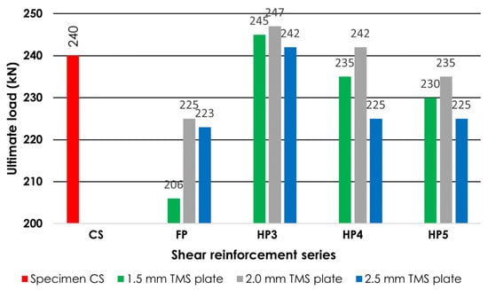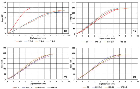 Specimens with plate thicknesses of 1.5 mm, 2.0 mm, and 2.5 mm were plotted graphically in blue, orange, and grey, respectively, in Figure 6. Of the nine specimens from the HP series with perforated TMS plates as shear reinforcement, the specimens with a perforated plate thickness of 2.0 mm attained the largest displacement before failure when compared with specimens of other plate thicknesses, as observed in Figure 6b–d [22].
