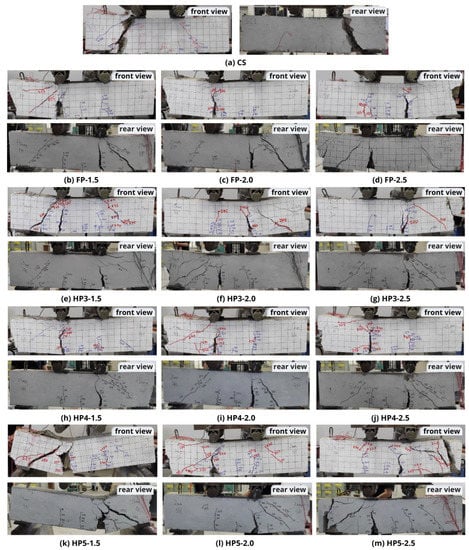 Both the FP series and HP series specimens showed similar crack patterns at the early and intermediate stages of loading but exhibited different failure modes towards the late stage of loading. At the early stage of loading, the first flexural crack in both series was observed at L1, L2, and/or L3 locations when loads ranging from 50 kN to 65 kN were applied. As the loads were increased incrementally from 100 kN to 165 kN, the first diagonal tension cracks were observed at the center of the compressive strut within the shear span. These flexural cracks were observed to widen rapidly when both series were loaded beyond 200 kN. As the specimens moved towards failure, differences in the progression of the diagonal tension crack development were observed in the FP and HP series. The diagonal tension cracks in the FP series specimens developed rapidly whilst the diagonal tension cracks in the HP series specimens developed gradually.