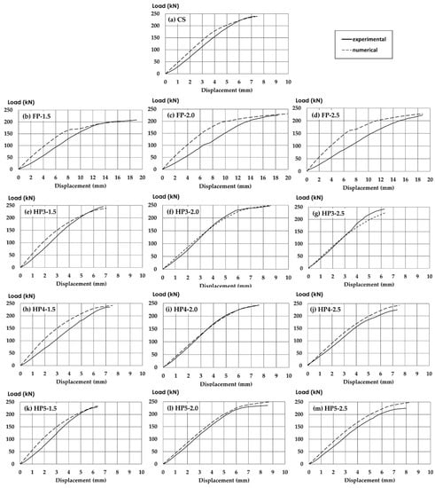 The load versus mid-span displacement curves for the experimental and numerical specimens were plotted in Figure 10. The experimental result was plotted as a solid line whereas the corresponding numerical result was plotted as a dashed line. In general, the numerical models assigned with TMS plate thicknesses of 2.0 mm and 2.5 mm generated similar load-displacement curves. However, the numerical model with the 1.5 mm thick TMS plate did not. Higher initial stiffness was yielded in the 1.5 mm thick TMS plate of numerical series. This is due to the assumption that interaction between the steel bar and the surrounding concrete was perfectly bonded in the numerical models resulting in greater overall stiffness [5,30,31]. This phenomenon was also observed in numerical studies by Jasim et al. [32] and Al-Gasham et al. [5]. Furthermore, assumptions made on the homogeneity of concrete material [31], the strain softening of concrete beyond the cracking strain [5,30], and time dependent effects [33] during numerical modelling can potentially increase the difference between experimental and numerical results.