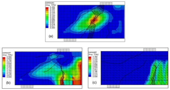 Figure 11 illustrates the comparison of the cracking developed in the experimental and numerical work for each specimen. Figure 12 shows the three general types of numerical crack pattern superimposed on the experimental results. The numerical concrete tension damage view was selected in this comparison as it represents the tension cracks formed in concrete. It is observed that all the numerical models showed a good correlation in progressive and ultimate tension crack patterns with the experimental specimens.