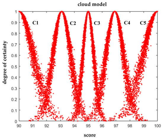 We divide each index into five levels of language evaluation vectors, which together can form an evaluation set. Assuming that the domain of an index in the evaluation set is , five clouds are generated in the domain according to the language scale of the index via the normal cloud model, and the clouds are used to represent the evaluation languages of different levels. It refers to the evaluation level and is expressed as the cloud scale.