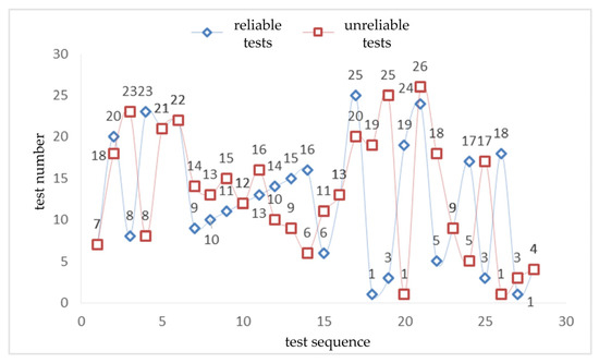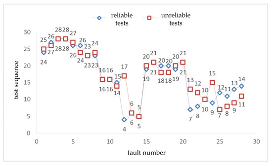 According to the analyses shown in Table 4 and Table 5, from the number of tests used, it takes 28 steps to locate all faults when the tests are reliable and unreliable. From the number of tests, it can be concluded that there is no difference between reliable tests and unreliable tests regarding the impact of fault isolation. From the perspective of the test sequence, when the test is reliable or unreliable, the test sequence and fault isolation sequence are all different, as shown in Figure 5 and Figure 6.