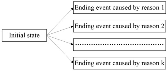 In Figure 1, assuming that an individual has an initial state and a set of ending events caused by reason , for the individual, the ending events are competing with each other. If the interested event is the ending event caused by reason 1, then other ending events are the competing events of the ending event caused by reason 1. In this case, if the competing events are treated as censored data, there will be a large deviation when estimating the interested event’s incidence risk using the Kaplan–Meier method [31]. So, the competing risk model should be used in this situation.