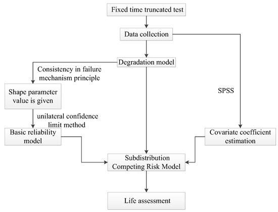 To summarize, it better reflects engineering reality to model the reliability and evaluate a product’s life from competing points of view. However, many studies constructed competing failure models when traumatic failure information existed [25,26,27,28]. They did not involve a zero traumatic failure data situation, which is the most common actual engineering situation during the period of using a product with high reliability. In order to solve the above problems, supposing that the failure rate ratio of the tested products does not change with time under different stress levels, this paper built a subdistribution competing risk model. Basic reliability with zero traumatic failure data is modeled by the unilateral confidence limit method under a two-parameter Weibull distribution. Performance degradation data are taken as covariates. The regression coefficients of the covariates are calculated and tested by SPSS software (version 22) [29]. The correctness and rationality of the method proposed in this paper are verified by a comparison with the modified maximum likelihood parameter estimation method [30], which does not consider competing failure and is only based on degradation information.