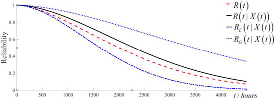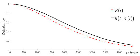 Reference [30] assumes that the spindle’s life follows the Weibull distribution. According to the degradation data and the modified maximum likelihood estimation method, reference [30] obtained the shape parameter and the scale parameter ; therefore, the reliability function is