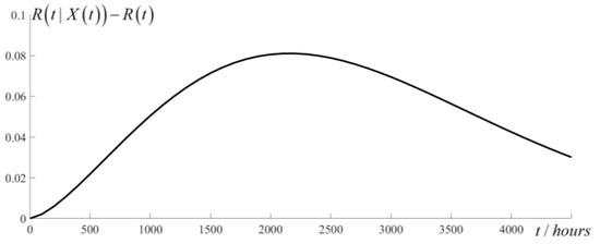 The reliability curves of and are shown in Figure 3, and the difference curve between the two reliability is shown in Figure 4.