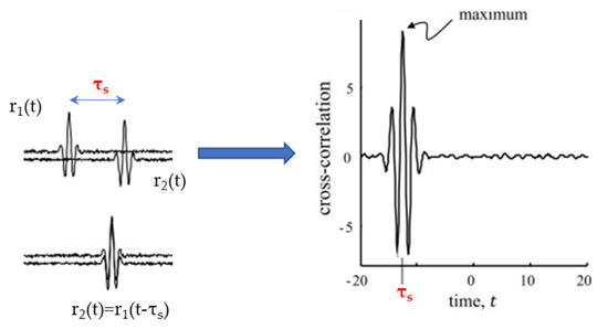 This function reveals a global maximum at τs, that is the time interval between consecutive echoes. The two amplitude-normalized signals r1(t) and r2(t), as well as the cross-correlation function, are presented in Figure 1.