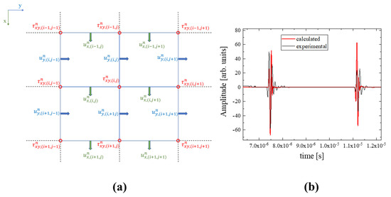 (a) Schematic representation of the velocity and stress components in a 2D grid. (b) Comparison between experimental and simulated pulse-echo signals.