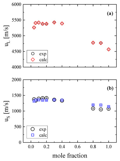 Experimental and calculated longitudinal (a) and transversal (b) sound velocities corresponding to the aluminosilicate glasses at room temperature. In both panels, the last (eleventh) points correspond to pure SiO2 glass.