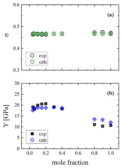 Figure 9a,b present the variation in the experimental and calculated Poisson’s ratio and Young’s modulus with mole fraction for the aluminosilicate and for pure SiO2 glasses. The Poisson’s ratio was found experimentally in the range 0.29 to 0.31. The corresponding value for pure SiO2 is 0.16. This difference is explained considering that most of the bonds in aluminosilicate glasses are ionic compared to the mainly covalent bonds in the case of SiO2. The number of bridging bonds per cation, which is expressed as the cross-link density of the structure, is strongly correlated with the Poisson’s ratio. When the cross-link density is equal to 2, 1, and 0, the values of the Poisson’s ratio are 0.15, 0.30, and 0.40. Since the Poisson’s ratio in the case of lanthanum aluminosilicate glasses is between 0.29 to 0.31, then the cross-link density is equal to 0.15 and the structure of the glasses is a 2D layer structure. For the 25La2O3–yAl2O3–(75–y)SiO2 glasses, the overall structure is dominated by four-fold AlO4 tetrahedra and six-fold AlO6 octahedral species [30] and references therein.