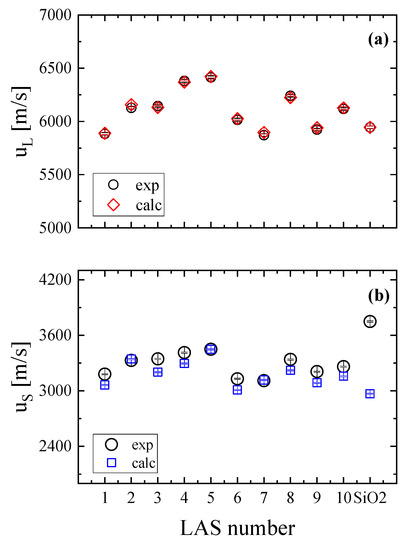 The experimental and the calculated longitudinal and transversal ultrasonic velocities and the elastic properties of the aluminosilicate glasses investigated in [30] are summarized in Table 4. Also, in this case, the first row for each glass composition corresponds to the experimental results, while the second row represents the corresponding calculated value after the simulation procedure.