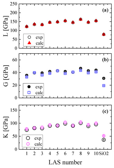 From Table 4, it is obvious that the longitudinal and transversal elastic constants, the Young’s modulus, and the bulk modulus are higher in aluminosilicate glasses relative to that of pure SiO2 glass. This behavior can be explained considering that the structure of the aluminosilicate glasses is characterized by a high network rigidity. The 15La2O3–xAl2O3–(85–x)SiO2 glasses reveal an increase in the elastic moduli with Al2O3 content. On the contrary, the elastic moduli of the 25La2O3–yAl2O3–(75–y)SiO2 glasses exhibit a completely different behavior with varying the Al2O3 content. The addition of lanthanum ions in the structure affects the coordination number of Al3+, which is evidenced experimentally [30] and references therein. Indeed, Al3+ ions are five-fold and six-fold coordinated in the structure of these glasses. These structural characteristics are reflected in the experimental longitudinal and transversal sound velocities of the aluminosilicate glasses under ambient conditions presented in Figure 7. In Figure 8, the experimental and calculated longitudinal, shear, and bulk moduli of the LAS and SiO2 glasses are shown. All moduli are found to be strongly affected by the Al2O3 content in the glasses.