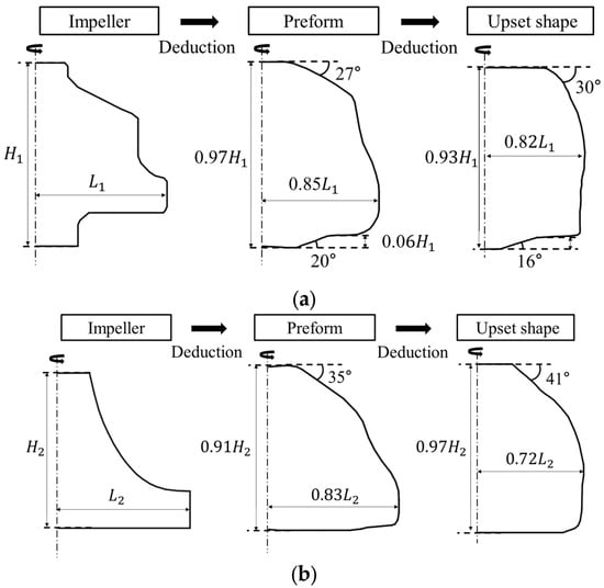 After applying the deduction to all three shapes, the preform shape was found to closely resemble the shape of each target impeller, while the upset shape was predicted to resemble the geometry caused by barreling effect that appeared after the billet was upset. This difference is particularly noticeable in Figure 7b, where the preform shape exhibits a protrusion that is similar to the lower part of the target impeller, while the upset shape exhibits a shape that is relatively similar to the barrel shape in the middle section rather than the lower section. Additionally, the maximum height H decreases when impeller is deduced, but increases when the preform is deduced. This can be interpreted as the height increasing to compensate for the decrease in volume due to the diminish of the maximum diameter L, which is predicted to approximate the shape of the billet after it is upset. Moreover, it can be observed that the angle at which the slope occurs in the upset shape, which resembles a cylinder with barreling, tends to decrease compared to that in the preform shape. Based on the upset shape obtained through deduction, the upsetting stroke design guideline presented in Section 3.3 is applied.