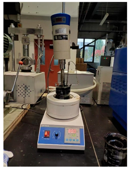 The preparation steps of MFAM are as follows: (1) determine the mass ratio of magnetite powder to asphalt binder by replacing limestone powder with equal volume magnetite powder according to a mass ratio of 1:1 of limestone powder to asphalt binder; (2) heat asphalt binder to 160 °C using an oven, after which stir it with a high-speed mixing device; and (3) add magnetite powder into the asphalt several times during mixing and stirring until the asphalt mastic is uniformly mixed. Figure 1 depicts the mixing process of MFAM.