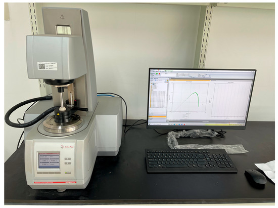 The Smart Pave 102 type DSR produced by Anton Paar Company of Austria (as shown in Figure 3) was adopted in this study. The high temperature rheological properties of MFAM after microwave heating were investigated via temperature sweep tests and frequency sweep tests. The parallel-plate with a diameter of 25 mm and a gap of 1 mm was selected in the tests. The temperature sweep tests were conducted between 46 °C and 82 °C at the constant stress of 0.12 Pa. The frequency sweep tests were performed from 0.1 Hz to 10 Hz at 40 °C, 50 °C, 60 °C, and 70 °C, respectively.