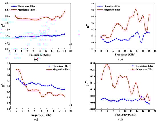 Change of electromagnetic parameters of limestone filler and magnetite filler with frequency: (a) ε′; (b) ε″; (c) μ′; and (d) μ″.