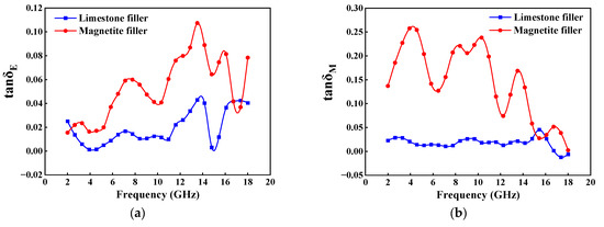 Change of tanδE and tanδM of limestone filler and magnetite filler with frequency: (a) tanδE and (b) tanδM.