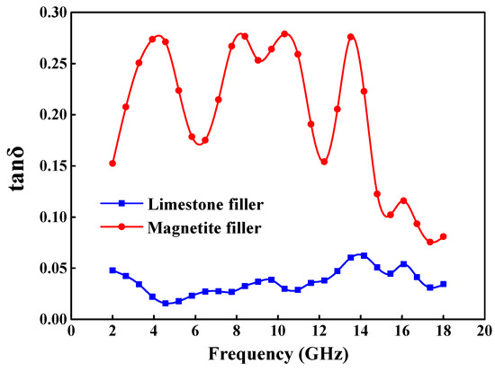 Figure 6 shows the tanδ of the limestone filler and the magnetite filler at different frequencies. As can be seen in the figure, the tanδ of the magnetite filler is between 0.05 and 0.28, and that of the limestone filler is between 0.01 and 0.07. The value of tanδ for the magnetite filler is the largest at a frequency of 4 GHz. The magnetite filler has a larger tanδ than the limestone filler, indicating that the magnetite filler has a better microwave absorption ability. The tanδ of the magnetite filler changes significantly with frequency, while that of the limestone filler changes slightly.