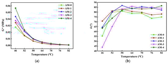 As can be seen from Figure 7b, the δ of AM-0, AM-1 and AM-2 gradually increases at 46 °C–58 °C, and that of AM-3 and AM-4 gradually increases at 46 °C–64 °C, and that of all MFAMs keep relatively steady at 58 °C–82 °C. The results mentioned above indicate that the elasticity of the MFAMs decreases, and the viscosity increases with the increase in temperature. The composition of elasticity and viscosity remains basically unchanged when temperature reaches a certain threshold. The δ of AM-2, AM-3, and AM-4 is almost the same and larger than that of AM-0 and AM-1 at 64 °C–82 °C, which indicates that microwave heating for over two hours has significant effects on the δ of MFAMs.