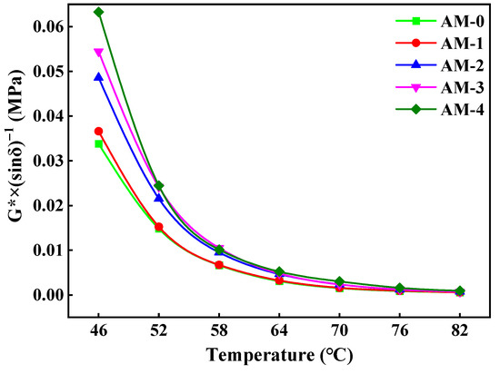 Figure 8 depicts the G* × (sin δ)−1 of the MFAMs after microwave heating at different temperatures. It can be seen that G* × (sinδ)−1 rapidly decreases with the increase in temperature, indicating that the anti-rutting performance of MFAMs drop sharply with a temperature increase. At 46 °C–52 °C, the MFAMs with longer microwave heating time have a larger G* × (sin δ)−1. The reason for this is that microwave heating hardens the MFAMs. Moreover, the longer the microwave heating time, the faster the G* × (sin δ)−1 decreased with temperature rising. The effect of microwave heating on G* × (sin δ)−1 gradually decreased with the increase in temperature.