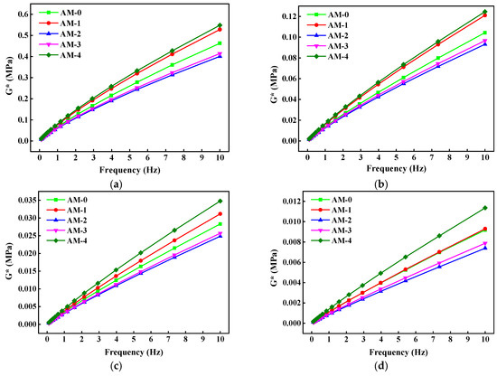 Complex shear modulus of MFAMs at different frequencies: (a) at 40 °C; (b) at 50 °C; (c) at 60 °C; and (d) at 70 °C.