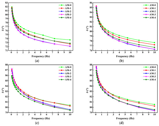 Phase angle of MFAMs at different frequencies: (a) at 40 °C; (b) at 50 °C; (c) at 60 °C; and (d) at 70 °C.