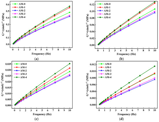 Figure 11 presents the G* × (sin δ)−1 of MFAMs after microwave heating at different frequencies. It can be seen that G* × (sin δ)−1 increases with the increase in frequency. The G* × (sin δ)−1 of each MFAM is relatively small at low frequencies. The higher the frequency, the more significant the effect of microwave heating time on G* × (sin δ)−1.