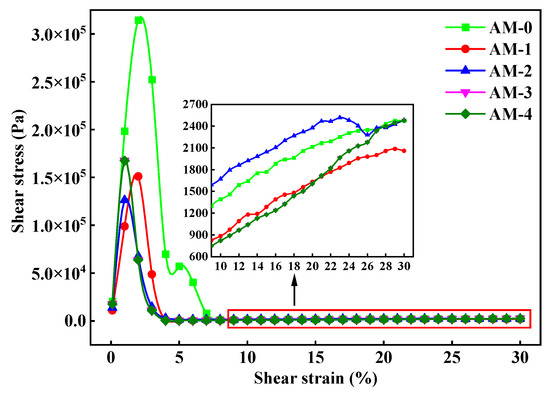 Figure 12 presents the stress–strain curves of the MFAM after microwave heating. As can be seen from the figure, the shear stress of the MFAM has a peak value. The stress–strain curve shape of the various MFAMs is basically the same. The shear stress first increases to a peak stress rapidly, and then drops to the lowest value sharply, and finally rebounds slowly. The peak shear stress of AM-0 is far larger than that of the other four MFAMs. The yield strain, the shear strain corresponding to the peak shear stress, is about 3% for AM-0 and AM-1, and about 2% for AM-2, AM-3, and AM-4. The results mentioned above indicate that microwave heating reduces the peak shear stress and yield strain of the MFAM.